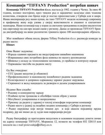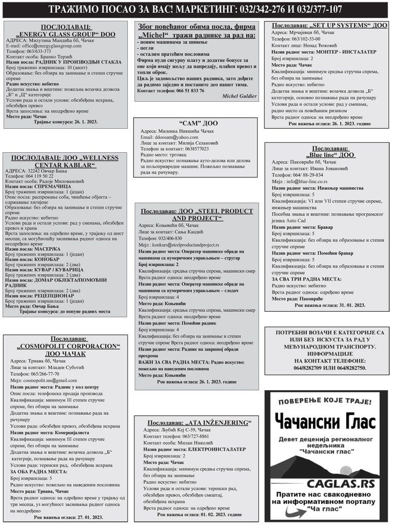 ПОСЛОДАВАЦ: „ЛАВАНИ“ ДОО Београд АДРЕСА: Владимира Гортана 24/1, Београд Телефон: 063/409-712 Лице за контакт: Никола Трипковић Назив посла: ЧИСТАЧ ПРОСТОРИЈА у објекту у Чачку Број тражених извршилаца: 4 (четири) Образовање: без обзира на занимање Радно искуство:без обзира на радно искуство Услови рада: рад у сменама Посебни услови: да је лице пријављено на евиденцију НСЗ најмање […]