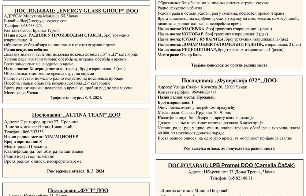 POSLODAVAC: SZTR „ 4 S“ ADRESA: 32104 Kulinovci, Ulica 659 br.10 Telefon: 062/334-102 E-mail: sanjatimotijevic2007@yahoo.com Lice za kontakt: Pavle Spasović Naziv posla: PEKAR Broj traženih izvršilaca: 2 (dva) Opis posla: pravljenje hleba, peciva, pita i bureka Obrazovanje: bez obzira na zanimanje i stepen stručne spreme Posebna znanja: poželjna vozačka dozvola „B“ kategorije Radno iskustvo: poželjno, […]