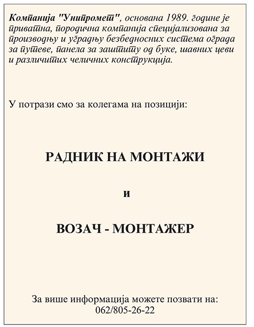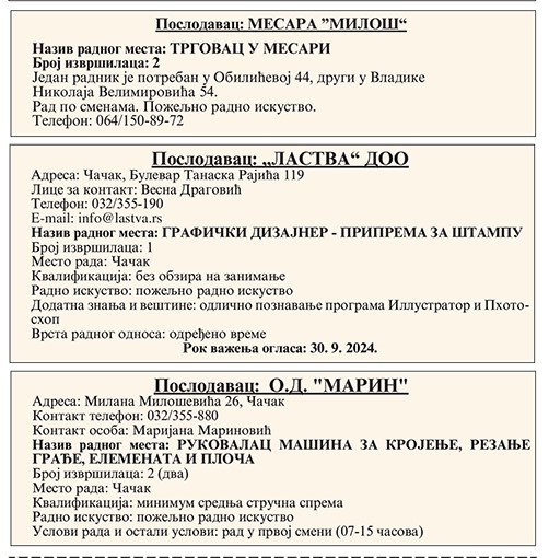 POSLODAVAC: DOO PEKARA PONS ADRESA: 32000 Čačak, Slavka Krupeža br. 77 Telefon: 064/859-2288 Lice za kontakt: Jelena Mitrović Naziv posla: PRODAVAC Broj traženih izvršilaca: 3 (tri) Opis posla: prodavac u pekari Obrazovanje: bez obzira na zanimanje i stepen stručne spreme Radno iskustvo: poželjno nije neophodno Vrsta zaposlenja: na određeno vreme u trajanju od mesec dana […]