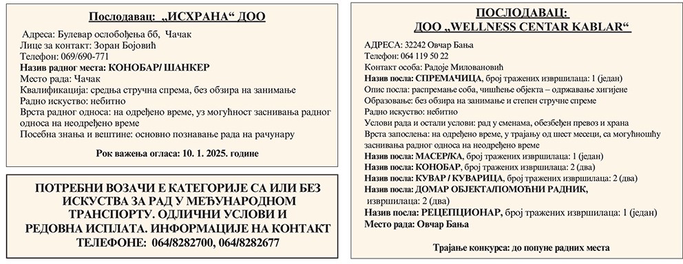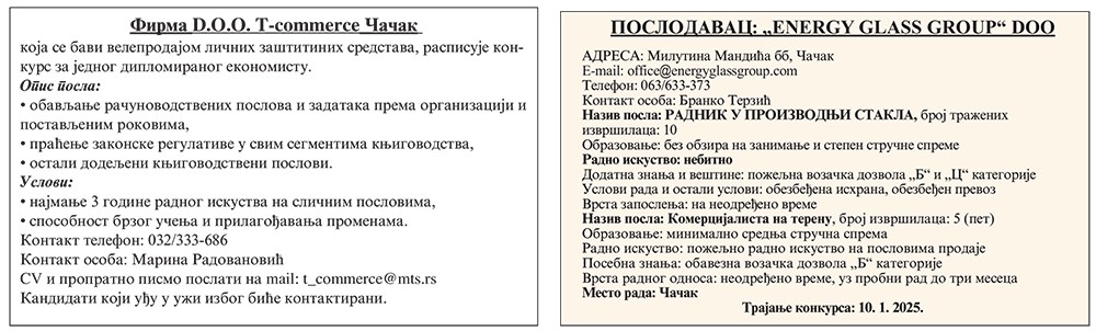ПОСЛОДАВАЦ: ДOO „AGROFIELD“ АДРЕСА: Љубић поље 6, Љубић, Чачак Телефон: 064/27-20-250 E-mail: agrosun@eunet.rs Контакт особа: Александар Јеремић Назив посла: РАДНИК У ПРОИЗВОДЊИ СТОЧНЕ ХРАНЕ Број тражених извршилаца: 1 (један) Образовање: без обзира на занимање и степен стручне спреме Радно искуство: небитно Услови рада: на одређено време уз предвиђени пробни рад Место рада: Љубић Трајање конкурса: […]