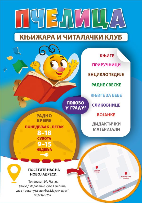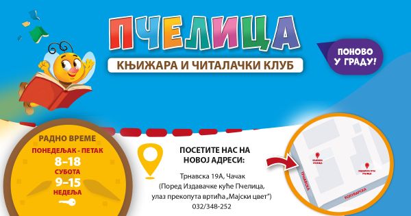 Књижара „Пчелица” је поново почела да ради данас, 9. јуна, у Трнавској 19А, у Чачку, у посебном објекту у оквиру седишта Издавачке куће „Пчелица“, а преко пута вртића „Мајски цвет”.