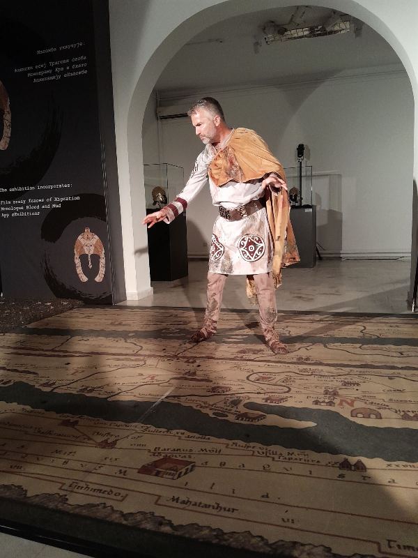 Мултимедијалну поставку чине непроцењиви експонати, три античка римска шлема из 4. века опточена златом, филмски есеј „Трагови сеоба“ и монодрама „Крв и блато“, која ће током трајања изложбе у Чачку бити изведена три пута. Прво извођење је било у петак 18. августа, а наредна два ће бити 7. и 15. септембра.