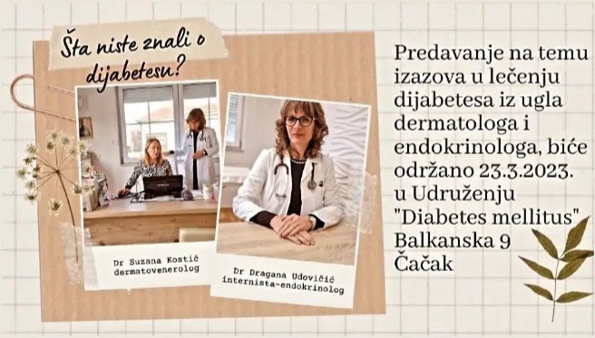 Предавање на тему изазова у лечењу дијабетеса из угла дерматолога и ендокринолога биће одржано у четвртак, 23. марта у 18.00 часова, у Друштву дијабетичара ,,Diabetes mellitus“, у Балканској улици бр. 9.