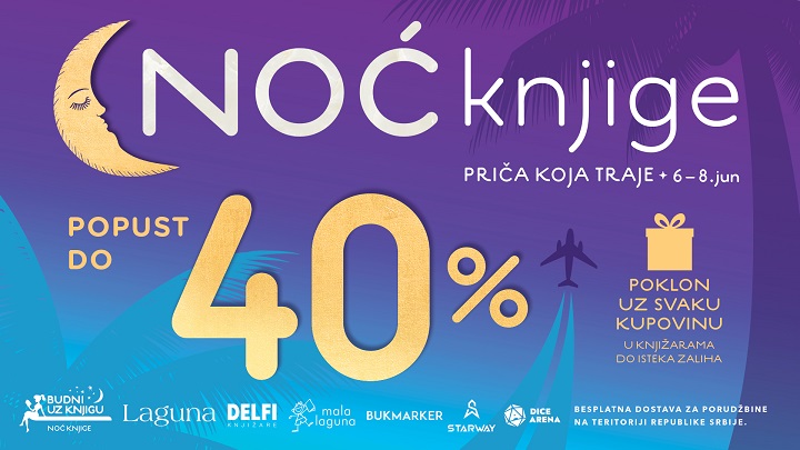 Od 6. do 8. juna 2025. godine u svim knjižarama Delfi i Laguninim klubovima čitalaca u Srbiji i regionu, na 62 lokacije u 36 gradova, kao i na sajtovima laguna.rs, delfi.rs i dicearena.rs održaće se još jedna Noć knjige, 32. po redu.