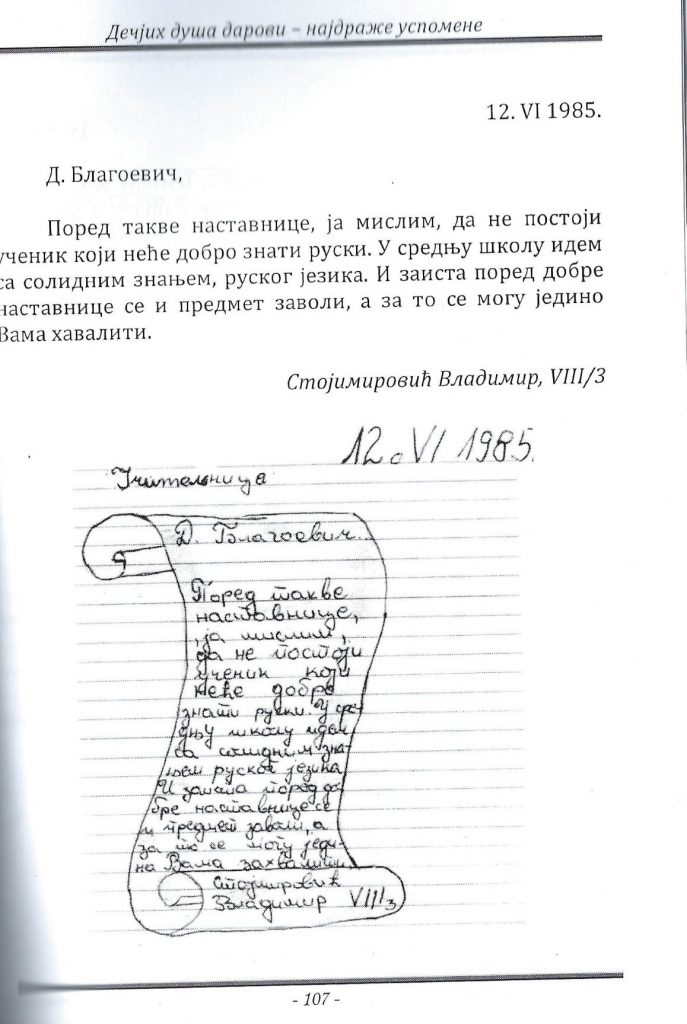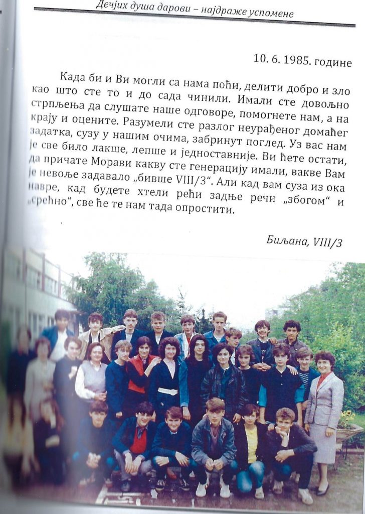 ”Време је да Вам кажем шта осећам. Док су ме многи наставници исмејавали, потцењивали, омаловажавали, грдили, кажњавали, оговарали, називали разним погрдним именима, злостављали и одбацивали, Ви сте се заинтересовали, саслушали, разумели, саветовали, подстицали, враћали ми веру у себе и успех, помагали, тражили у мени добро… Сада знам да би без Ваше подршке пропала. Нико ми није веровао, разумео, нико ме није волео, сем Вас. Захваљујући Вама, нашла сам себе и верујем да ћу успети у животу. Ви сте ме у то уверили и зато ћу Вам остати захвална целог живота. Много Вас волим и увек ћу Вас волети”, написала је једна ученица на крају осмогодишње школе наставници Дани, пре 30 и више година…