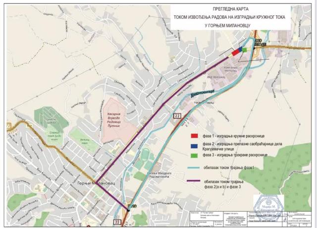 На основу Комерцијалног уговора о пројектовању и извођењу радова на изградњи обилазнице око Горњег Милановца и Решења о грађевинској дозволи бр. ROP-GML-28030-CPI-4/2022 издатог од стране општине Горњи Милановац, Решења за уградњу и постављање привремене саобраћајне сигнализације и опреме издатог од стране Министарства грађевинарства, саобраћаја и инфраструктуре број: 344-08-76207/2023-03 од 30.08.2023.године, обавештавамо Вас да ће се у понедељак дана 23.10.2023.године од 07 часова извршити потпуно затварање ул. Кнеза Aлександра у смеру ка центру Горњег Милановца ( посматрано из смера насеља Неваде). Саобраћајни токови који се крећу Крагујевачком улицом ( државним путем IIА реда број 177), тј. који долазе из смера Крагујевца, биће преусмерени на трасу државног пута IБ реда број 22 ( петља на стационажи 107 + 646) до наредне петље ( на стационажи 110 + 296 ) преко кoје се улази у Горњи Милановац.
