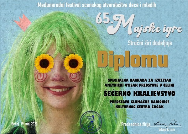 На управо завршеној међународној смотри позоришног стваралаштва деце и младих, 65. Фестивалу мајске игре одржаном у Бечеју, представа Глумачке радионице Културног центра Чачак „Шећерно краљевство“ освојила је чак шест награда.