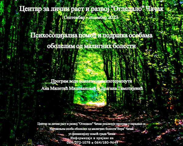 Пројекат „Психосоцијална помоћ и подршка особама оболелим од малигних болести” реализује се у „Огледалу“ од 2018. године и једини је те врсте у нашем граду. И ове године Град Чачак је финансијски подржао пројекат. Програм реализују Драгана Тимотијевић и Ана Милетић Миловановић, психолози-психотерапеути Центра за лични раст и развој „Огледало“. Као и до сада, партнери на пројекту су Удружење особа оболелих од малигних болести “Вера”, Удружење “Здрав дух” и Планинарско друштво “Каблар”.