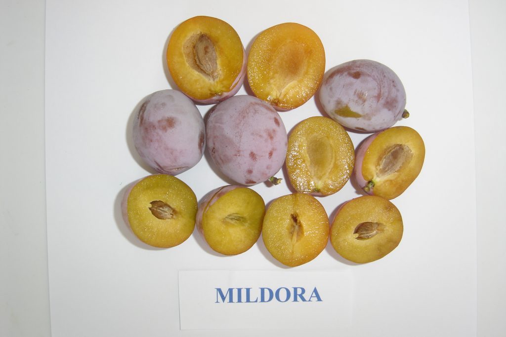 Милдора је настала 1980. године укрштањем сорти ларџ шугар (Large Sugar Prune) и чачанске лепотице. Оплемењивачи су др Добривоје Огашановић, проф. др Милојко Ранковић, др Светлана А. Пауновић и др Олга Митровић. Стабло јој је умерено бујно, крошња прилично густа. Плод јој је округластог до јајастог облика. Родност варира, зависно од године и локалитета.