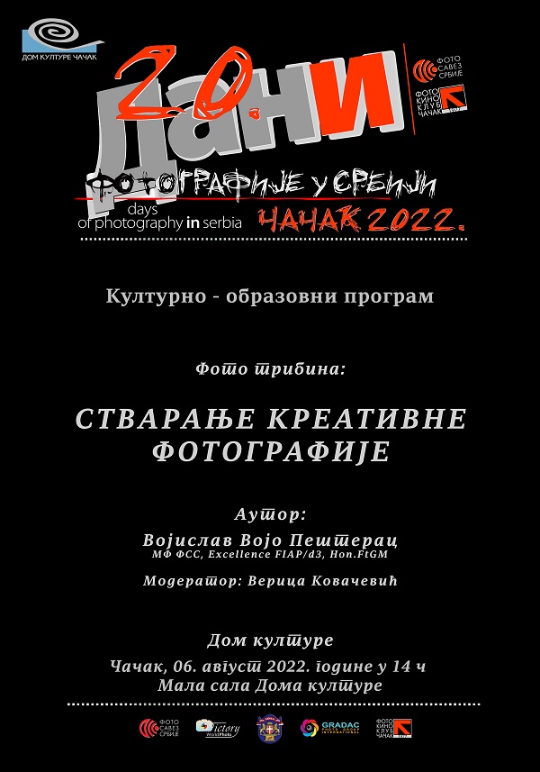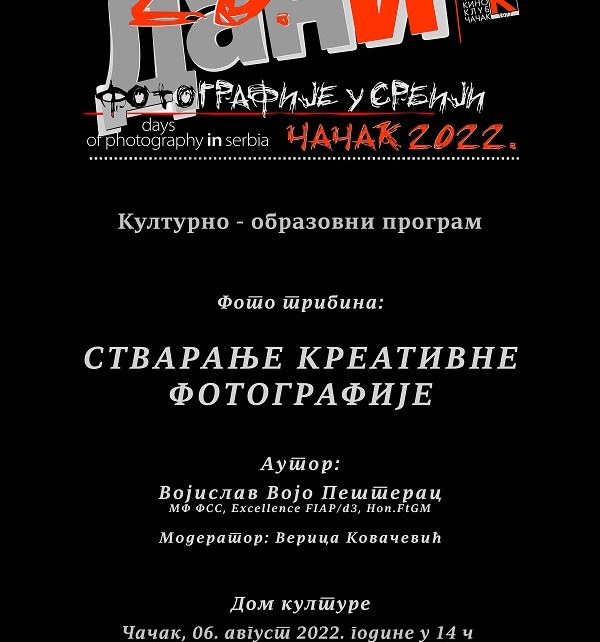 Фото трибина на тему: СТВАРАЊЕ КРЕАТИВНЕ ФОТОГРАФИЈЕ, аутора ВОЈИСЛАВА ВОЈА ПЕШТЕРЦА, мајстора фотографије Фото савеза Србије је отказана, а требало је да буде одржана у оквиру Дана фотографије у Србији, у организацији Културно – образовног програма Дома културе и Фото кино клуба Чачак, у суботу, 6. августа, у 14 часова, у Малој сали Дома културе.