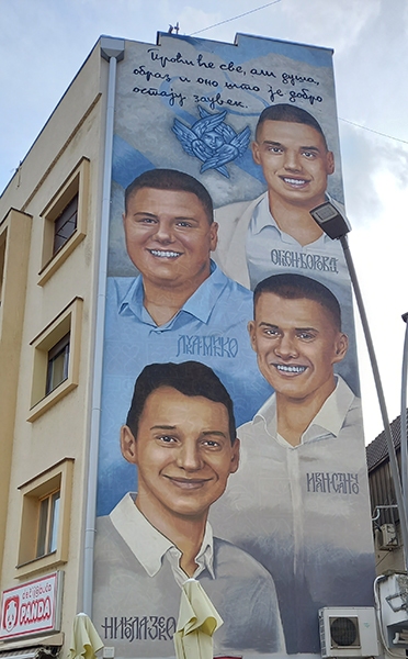 На зиду стамбене зграде на Градском тргу, прошлог четвртка, свечано је откривен мурал посвећен четворици трагично настрадалих младића. На муралу, који су урадили уметници Стеван и Марија Шолц, оживљена су четири насмејана лика са њиховим именима и надимцима: Огњен – Боровац, Лука – Мићко, Иван – Станчо и Никола – Зеко, и исписаном поруком патријарха Павла: “Проћи ће све, али душа, образ и оно што је добро остају заувек”. У реализацији ове иницијативе помогли су и уметници Божидар Плазинић и Велимир Милићевић, а идејно решење је скицирао Милан Чакајац.