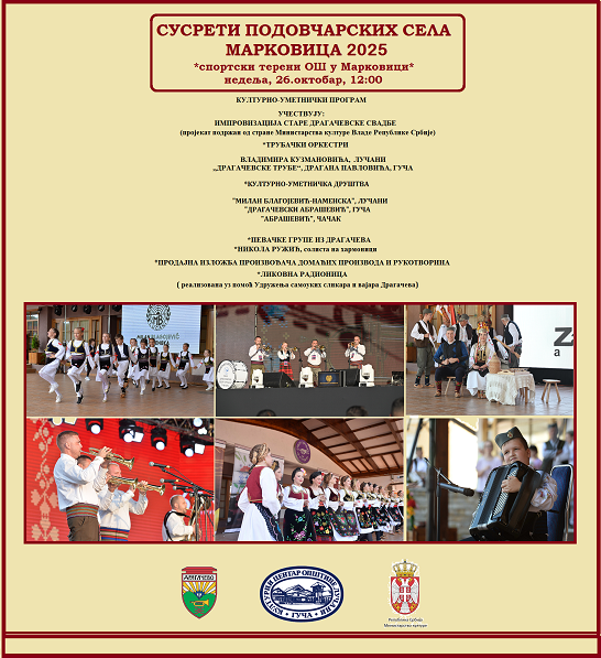 У недељу, 26. октобра на спортским теренима ОШ у Марковици биће организована манифестација под називом „Сусрети подовчарских села“. У културно-уметничком програму учествују: