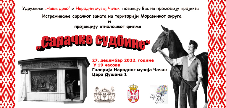 У уторак, 27. децембра, у 19 часова, у Галерији Народног музеја Чачак биће представљен пројекатУдружења „Наше дрво“ и Народног музеја Истраживање сарачког заната на територији Моравичког округа и пројекцији филма „Сарачке судбине“.