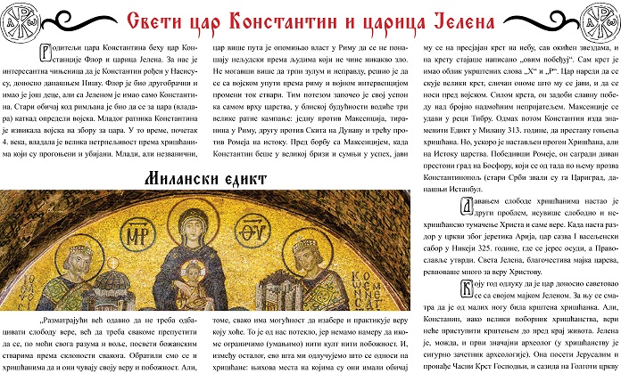 Родитељи цара Константина беху цар Констанције Флор и царица Јелена. За нас је интересантна чињеница да је Константин рођен у Насисусу, доносно данашњем Нишу. Флор је био другобрачни и имао је још деце, али са Јеленом је имао само Константина. Стари обичај код римљана је био да се за цара (владара) каткад определи војска. Младог ратника Константина је извикала војска на збору за цара. У то време, почетак 4. века, владала је велика нетрпељивост према хришћанима који су прогоњени и убијани. Млади, али незванични, цар више пута је опомињао власт у Риму да се не понашају нељудски према људима који не чине никакво зло. Не могавши више да трпи зулум и неправду, решио је да се са војском упути према риму и војном интервенцијом промени ток ствари. Тим потезом започео је свој успон ка самом врху царства, у блиској будућности водиће три велике ратне кампање: једну против Максенција, тиранина у Риму, другу против Скита на Дунаву и трећу против Ромеја на истоку. Пред борбу са Максенцијем, када Константин беше у великој бризи и сумњи у успех, јави му се на пресјајан крст на небу, сав окићен звездама, и на крсту стајаше написано „овим побеђуј“. Сам крст је имао облик укрштених слова „Х“ и „Р“. Цар нареди да се скује велики крст, сличан ономе што му се јави, и да се носи пред војском. Силом крста, он задоби славну победу над бројно надмоћним непријатељем. Максенције се удави у реци Тибру. Одмах потом Константин изда знаменити Едикт у Милану 313. године, да престану гоњења хришћана. Но, ускоро је настављен прогон Хришћана, али на Истоку царства. Победивши Ромеје, он сагради диван престони град на Босфору, који се од тада по њему прозва Константинопољ (стари Срби звали су га Цариград, данашњи Истанбул.