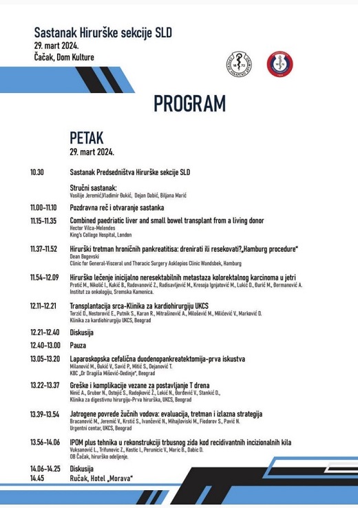 Општа болница Чачак ће у петак, 29. марта, бита домаћин редовног састанка хируршке секције СЛД, који ће бити одржан у Културном центру Чачка са почетком у 11 часова.