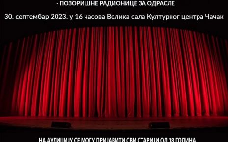 АУДИЦИЈА ЗА ГЛУМАЧКИ АТЕЉЕ КУЛТУРНОГ ЦЕНТРА ЧАЧАК – ПОЗОРИШНЕ РАДИОНИЦЕ ЗА ОДРАСЛЕ биће одржана 30. септембра, у 16 часова у Великој сали Културног центра Чачак. За аудицију је потребно припремити један монолог и казивање једне песме(поезија), а можете нам приказати и неке од додатних талената попут певања, плеса, свирања, имитација… За све додатне информације позовите […]