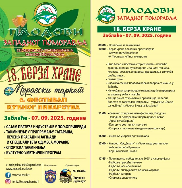 Привредно гастрономска манифестација ,,Дани западног поморавља“ биће одржана сутра у Заблаћу. Примарни циљ оснивања манифестације, која се ове године одржава по 18. пут, биo је и остао представљање пољопривредних произвођача из ових крајева.