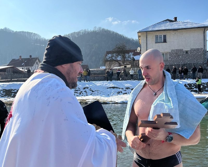 – Учествујем трећи пут, а ово је други пут како први стижем до Крста. Данас је било доста деце из школе која су са својим учитељима и наставницима дошла да нас подрже, да присуствују литургији и пливању, веома ми је драго због тога. Посебно волим празнике јер се тада сви мештани Гуче окупе да их заједно прославе, иако нас има све мање трудимо се да сачувамо дух заједништва, а ова година ми је посебно драга јер смо супруга и ја добили сина. Волео бих да и наредних година буде све више младих који ће учествовати – рекао је Вељко Драмлић, који је први допливао до Часног крста у хладној Бјелици.