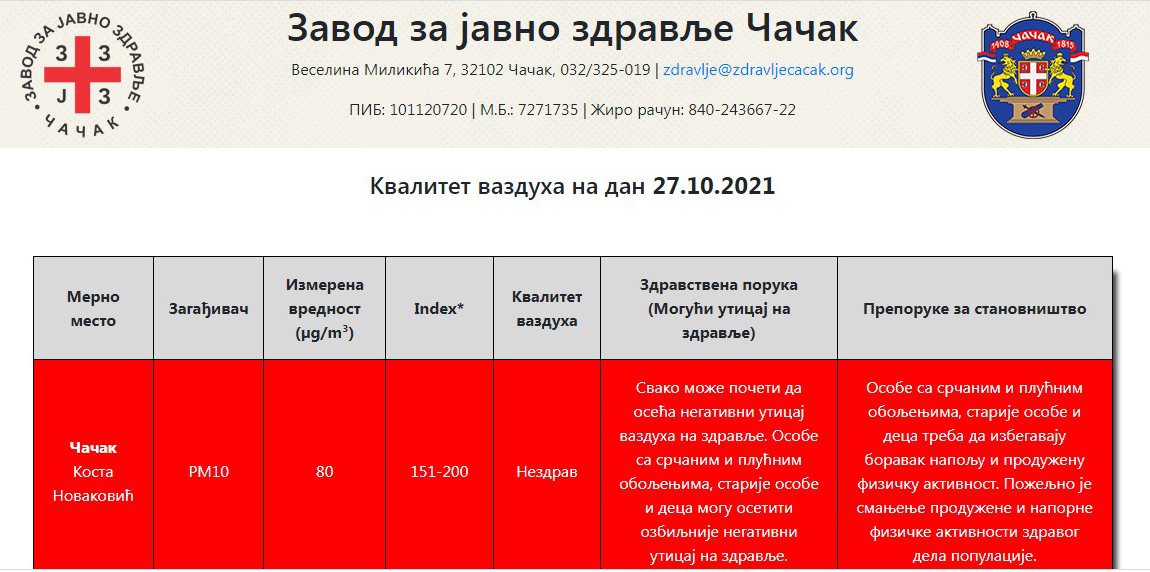 Завод за јавно здравље Чачак објавио је данас резултате мерења квалитета ваздуха: