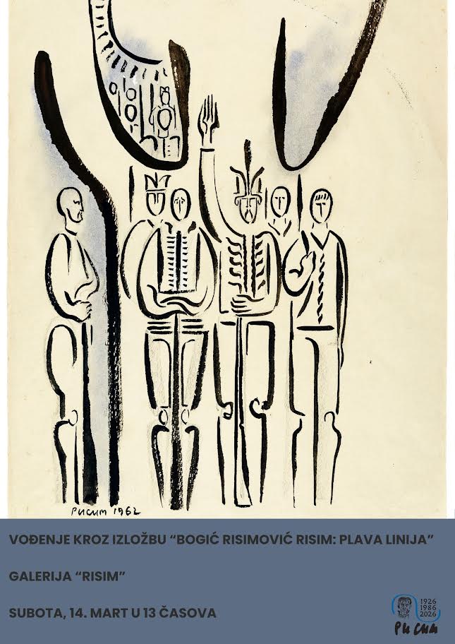 У суботу, 14. марта, у 13 часова, у Галерији “Рисим”, биће организовано још једно стручно вођење кроз изложбу цртежа Богића Рисимовића Рисима “Плава линија”. Посетиоцима ће овог пута ауторка ове поставке Катарина Стевлић, кустос Уметничке галерије “Надежда Петровић”, детаљније представити и објаснити изложених 75 цртежа. Они највећим делом представљају илустрације за рубрику “Легенде из наших крајева” коју је новинар Мирко Милојковић објављивао у “Илустрованој политици”, а има и оних рађених за часописе, новине и књиге. Важно је истаћи да је већина њих први пут јавно приказана.