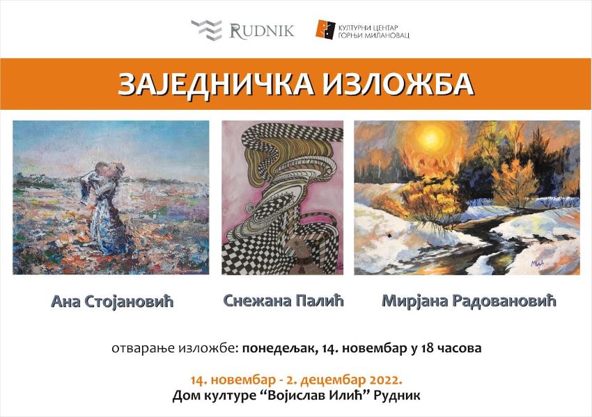 Ана Сојановић, Снежана Палић и Мирјана Радовановић, надарене уметнице представиће своје стваралаштво у понедељак, 14. новембра 2022. године у Галерији Дома културе „Војислав Илић“ на Руднику, у 18.00 часова.