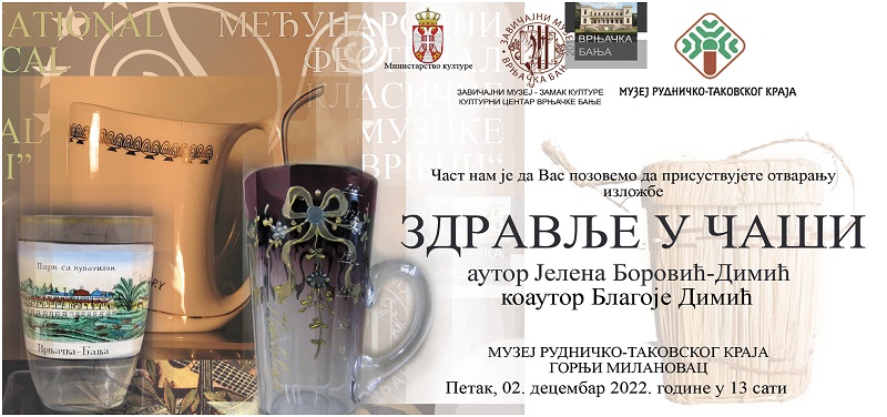 Изложба Завичајног музеја Врњачке Бање „Здравље у чаши“ ауторке Јелене Боровић Димић и коаутора Благоја Димића биће отворена у Галерији Музеја рудничко-таковског краја у петак, 2. децембра, у 13 сати.