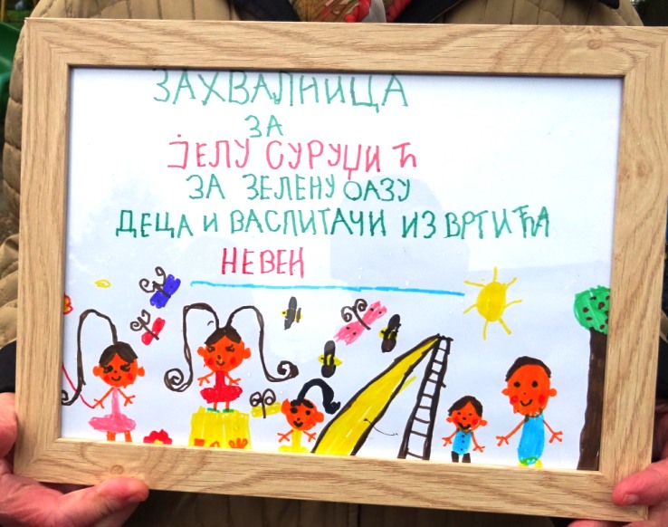 – Овако нешто може да уради само велика мајка све деце Чачка, а то је Јела Суруџић! Она је свог поклона за рођендан купила саднице и показала колико брине о најмлађима да би их заштитила од издувних гасова, прашине, буке. Они су јој захвални, као и ми, васпитачи и родитељи. Нама остаје да генерацијама које долазе пренесемо њен хуманитарни рад и шта је све учинила за нашу установу, за децу Чачка, а и шире се зна за њено име. Можемо да пожелимо нашој Јели је добро здравље и да се даље дружи са нама – каже Марија Стојановић, главна васпитачица вртића ”Невен”.